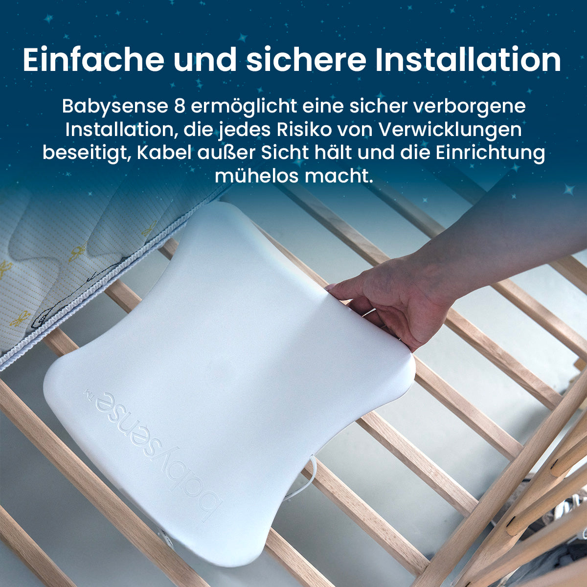 Babysense 8 – verfolgt die Atembewegung Ihres Babys mit zwei Sensorpads und gibt einen Alarm aus, wenn die Bewegung stoppt oder unregelmäßig langsam wird. Dieses berührungslose System bietet Echtzeitwarnungen ohne WLAN und gewährleistet so eine zuverlässige und sichere Überwachung.