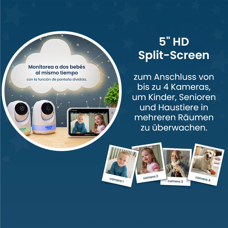 - Split-Screen: Überwachen Sie zwei Babys oder Bereiche gleichzeitig für zusätzliche Sicherheit.