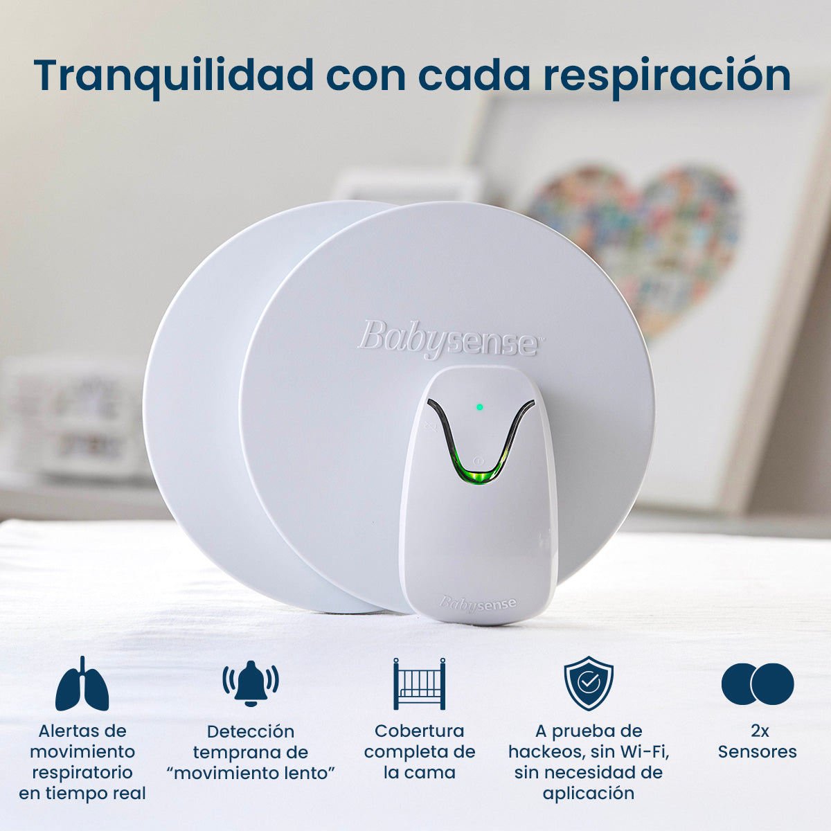 El Babysense 7 - monitorea los movimientos respiratorios de tu bebé mediante dos placas sensoras y emite una alarma si el movimiento se detiene o se vuelve irregularmente lento. Este sistema sin contacto proporciona alertas en tiempo real sin necesidad de WiFi, garantizando un monitoreo fiable y seguro.