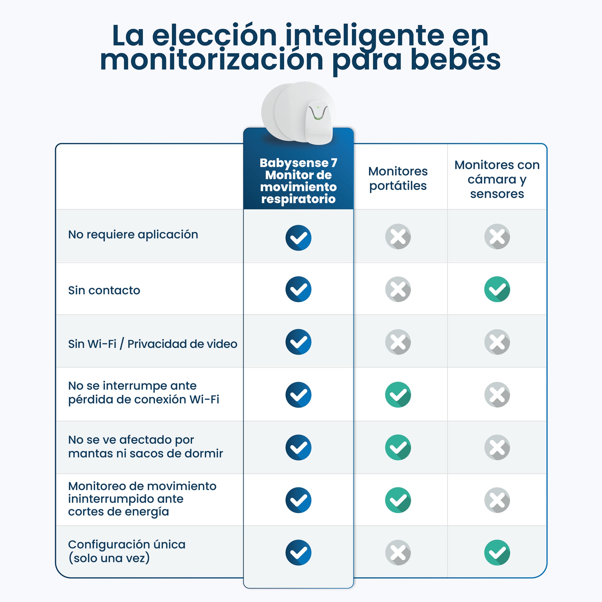 - Sin contacto y sin necesidad de llevar puesto: Monitoreo sin complicaciones que no molesta a su bebé; sin dispositivos portátiles ni contacto.