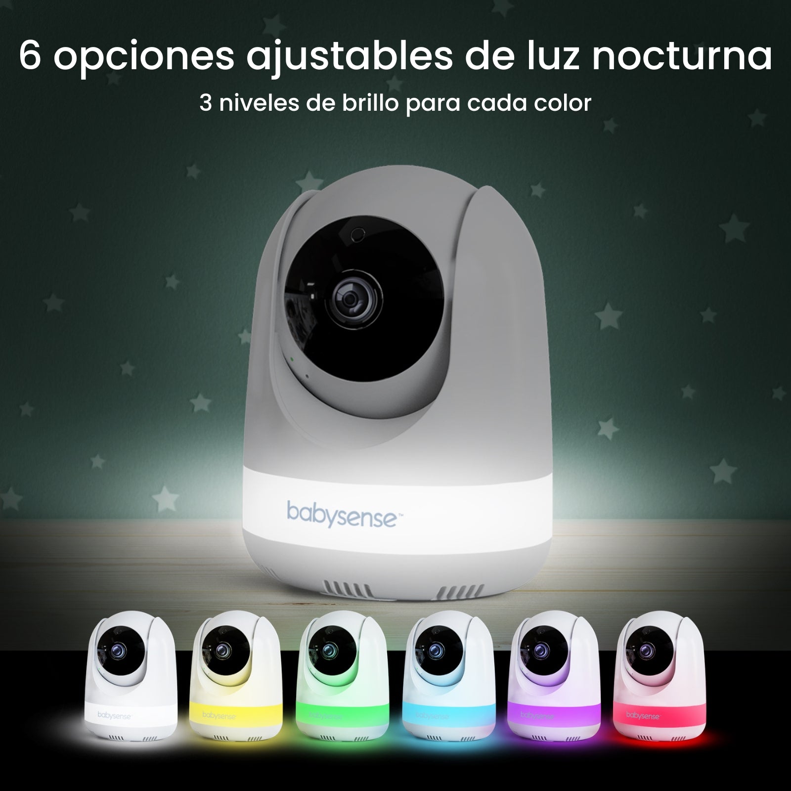 - Cámaras con luz nocturna RGB de 6 colores: Personalice un ambiente relajante con seis colores calmantes de luz nocturna para ayudar a su bebé a dormir plácidamente.