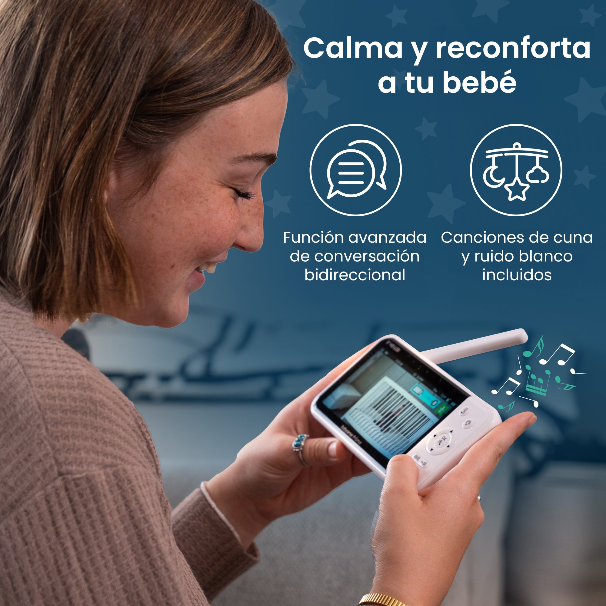 Cuando su bebé necesite que lo calmen o lo consuelen, puede utilizar la función avanzada de hablar con el bebé y las canciones de cuna integradas con sonidos de ruido blanco.
