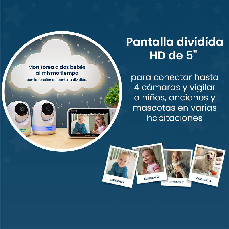- Pantalla dividida: Supervise a dos bebés o áreas al mismo tiempo para mayor tranquilidad.