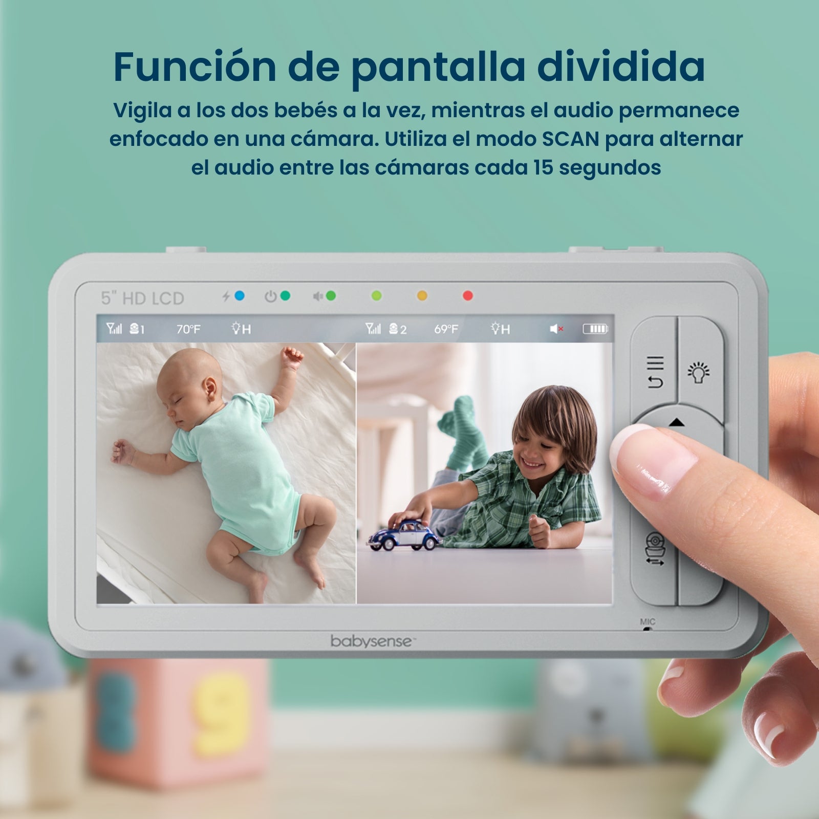 El monitor de video ofrece visualización en pantalla dividida, lo que le permite ver dos cámaras desde 2 habitaciones simultáneamente. Visualización nítida en una unidad para padres dedicada a través de una pantalla HD de 5".