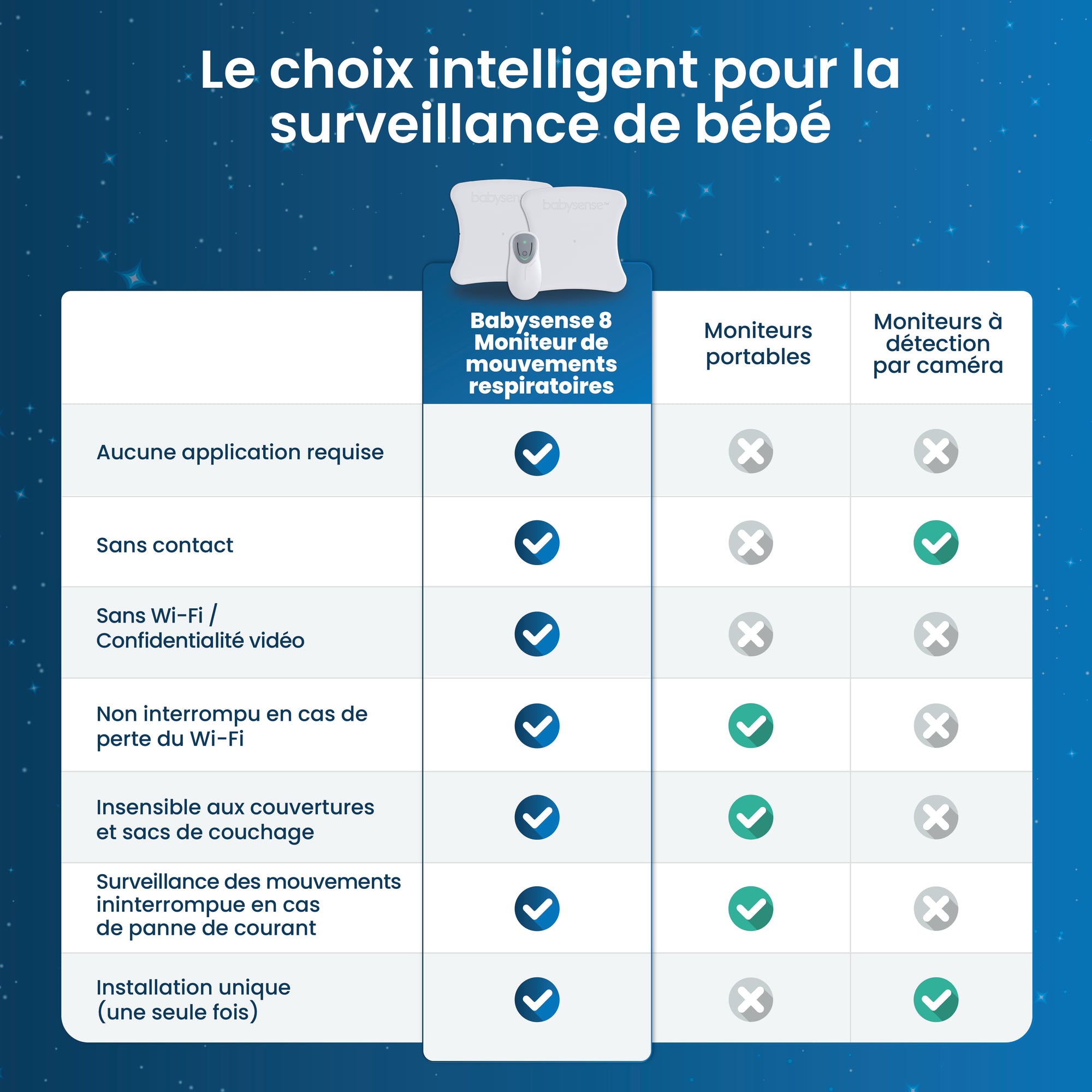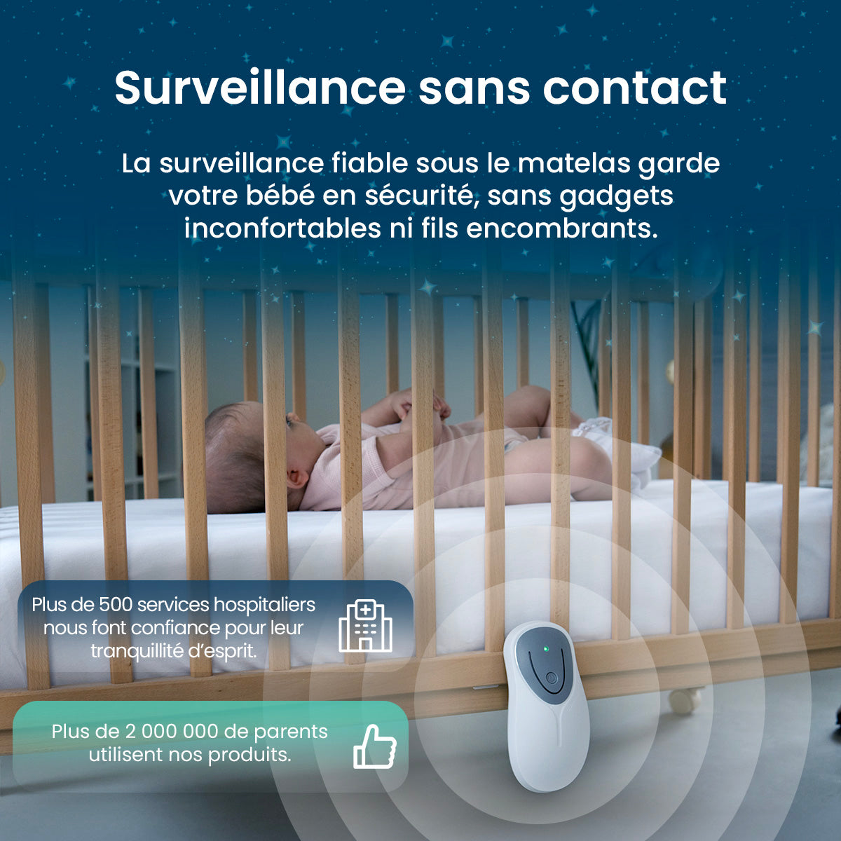 - Sans contact et sans dispositif à porter : Surveillance sans tracas, sans perturber votre bébé – aucun dispositif portable ou contact n'est nécessaire.