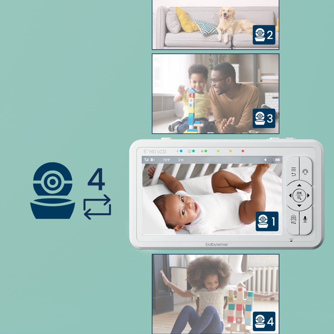 La solution Babysense True Sleep est livrée en standard avec deux capteurs respiratoires, deux caméras panoramique-inclinaison-zoom et un écran HD dédié de 5", garantissant une couverture complète du berceau et de la pièce.