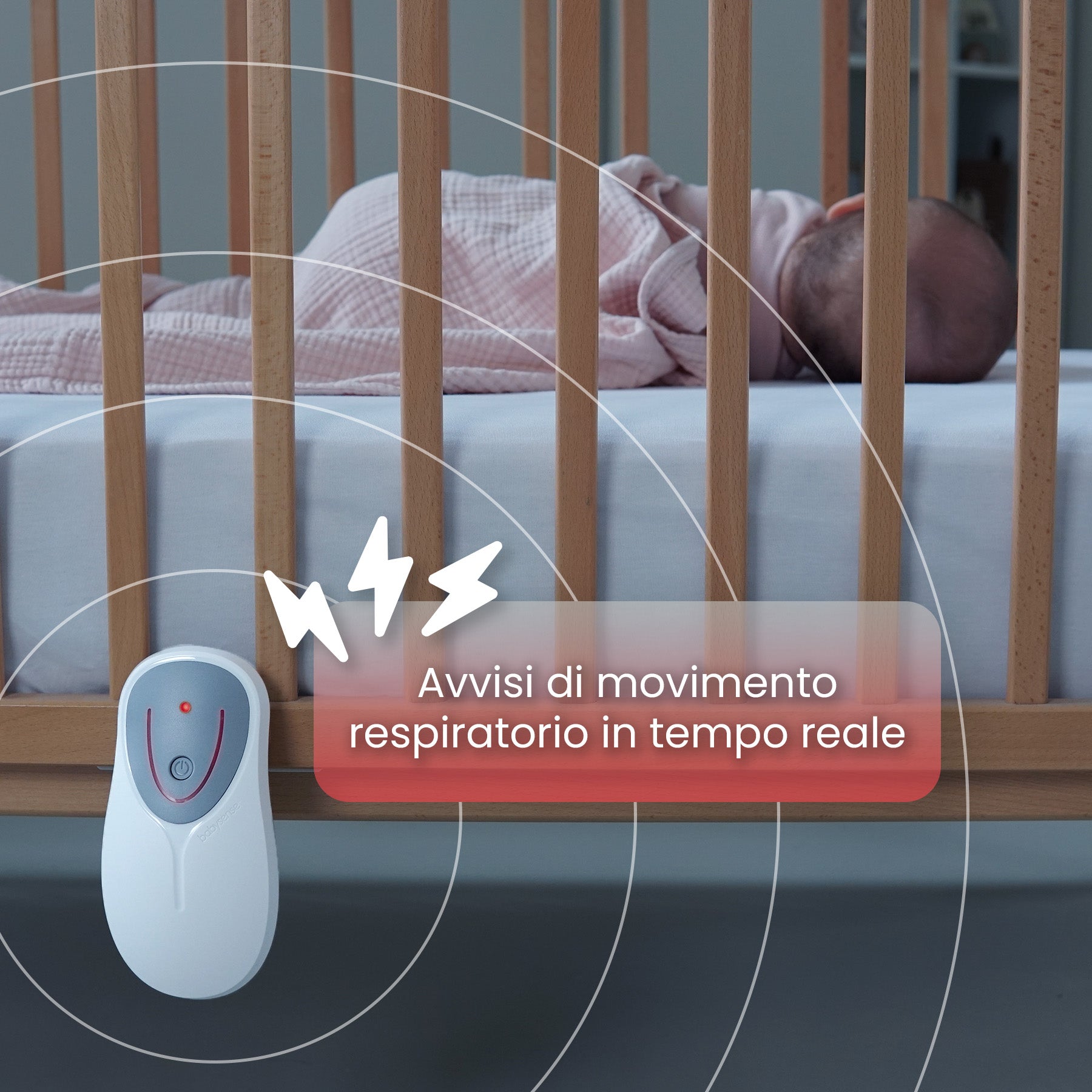 - Monitoraggio del movimento respiratorio con avvisi di sicurezza: Rimani informato con avvisi in tempo reale, monitorando il movimento respiratorio del tuo bambino per una maggiore tranquillità.