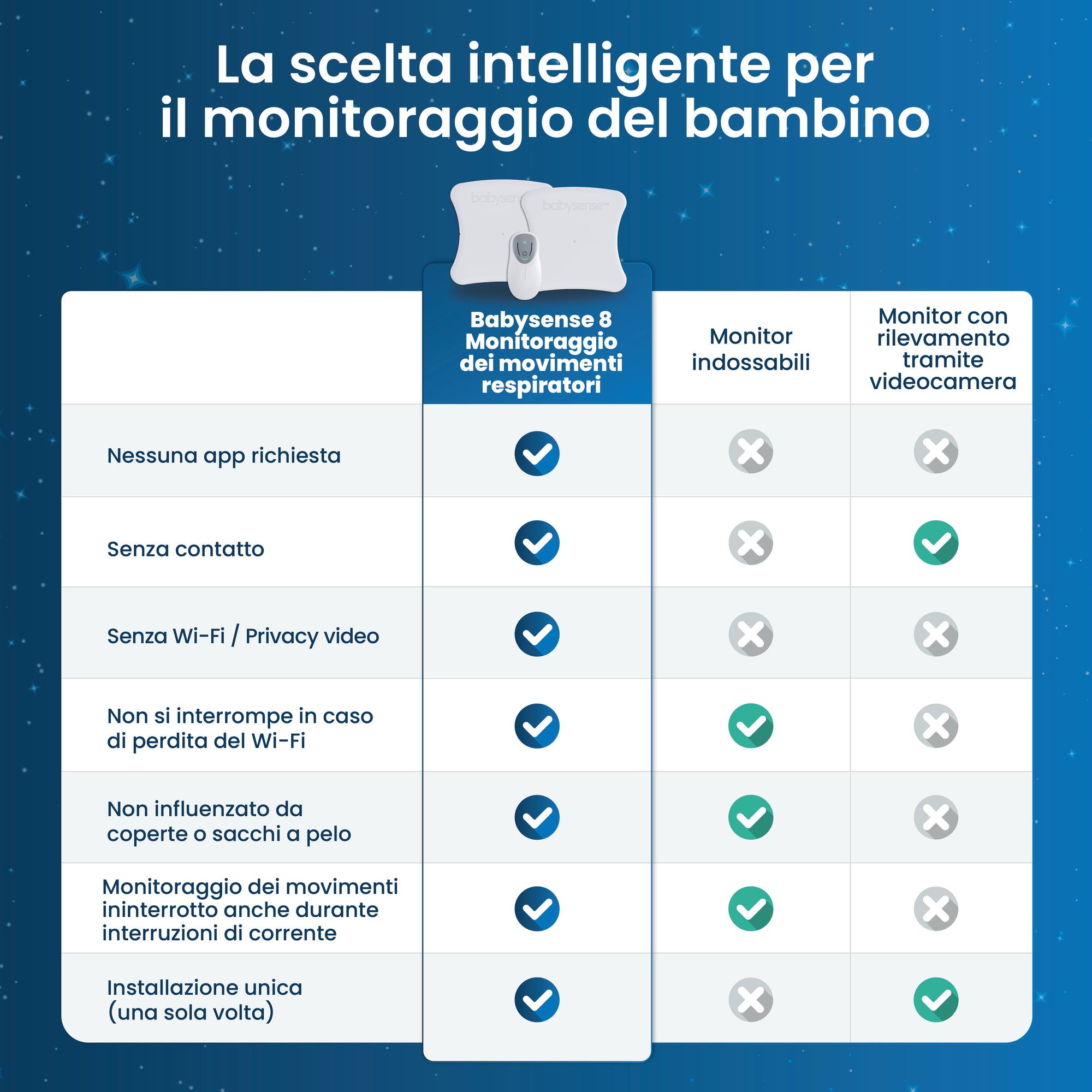 - Non a contatto e non indossabile: Monitoraggio senza problemi senza disturbare il tuo bambino—senza dispositivi indossabili o a contatto.