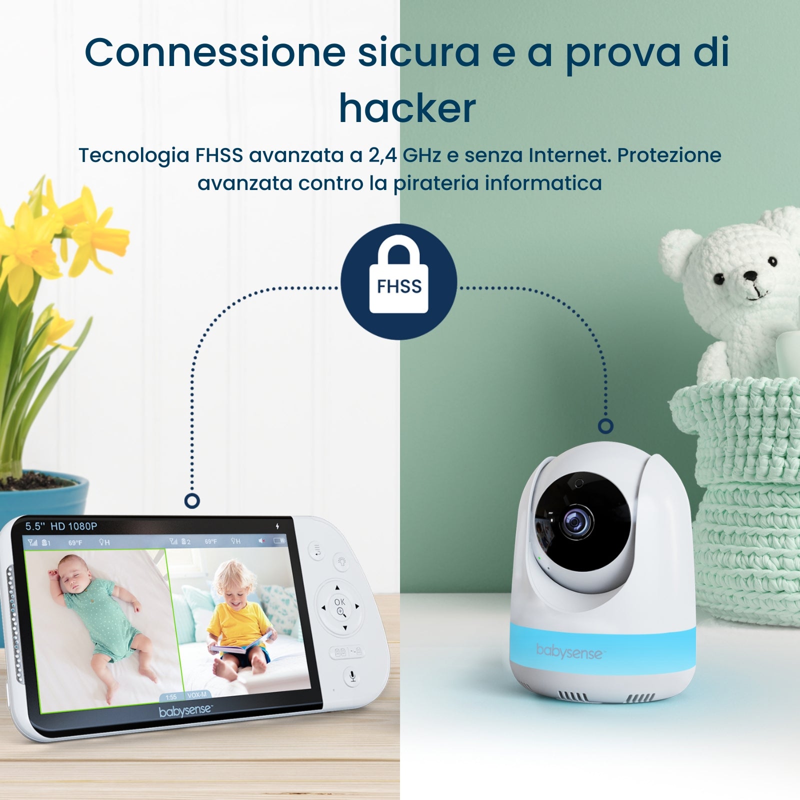 Privo di Internet e WiFi con tecnologia avanzata 2.4GHz FHSS, che garantisce una connessione privata e sicura tra le telecamere e il monitor, impedendo qualsiasi accesso non autorizzato. Stai tranquillo, solo tu monitorerai il tuo bambino.
