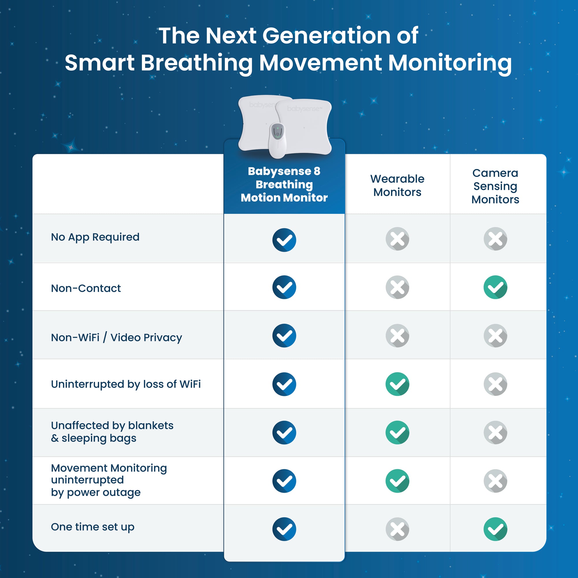 The Babysense 8 - tracks your baby’s breathing motion with two sensor pads and sounds an alarm if movement stops or becomes irregularly slow. This non-contact system provides real-time alerts without WiFi, ensuring reliable and secure monitoring.